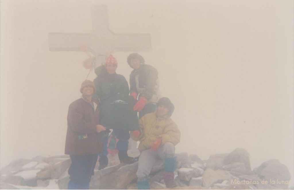 Otros veinte metros aproximadamente separaban la salida de la cresta a la cruz que marca el punto culminante del Aneto. Tres mil cuatrocientos cuatro metros. Estábamos en el “techo de los Pirineos”, en el trono del “Monarca de los Pirineos”, lo habíamos conseguido. La alegría y el regocijo eran inmensos pero la enorme y gris nube no se levantaría para que pudiéramos disfrutar aún mas de nuestro éxito admirando el resto de valles, montañas y mundo bajo nuestros pies. Hasta el Mulhacén al sur en Sierra Nevada o los Alpes al norte, no había otra montaña más alta que esta en muchos kilómetros a la redonda. Tenía dieciocho años y era un martes y trece. Saludamos a nuestro amigo asiático que nos hizo una foto en la cumbre del Aneto para la posteridad.