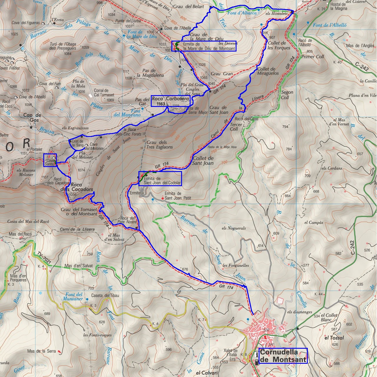 Saco un libro de la Biblioteca Sagrada Familia de Barcelona: “El Priorat. 19 excursions per valls i muntanyes” y conjuntamente con un mapa del ICC de la comarca de El Priorat, reviso y estudio las diferentes rutas, llamándome la atención una que desde las cercanías de la población de Cornudella de Montsant, se dispone a subir a su pico más alto: Roca Corbatera. A la vez busco en el Wikiloc otras rutas que pasasen por el mismo lugar… y al final ideo mi propia ruta, mi propio recorrido, para comenzar a disfrutar y a pisar por primera vez esta fantástica y “santa” sierra.