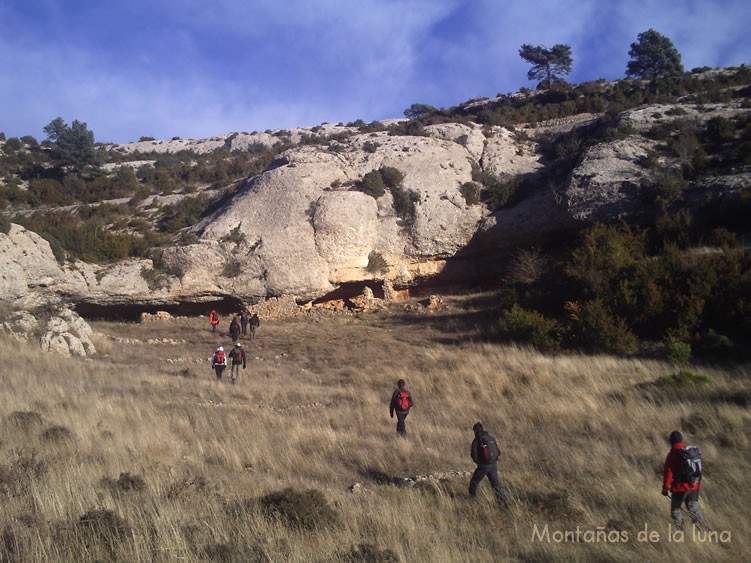 Este es el último punto en el que seguiremos la loma cimera de la Serra Major de Montsant. Aquí ya bajamos al vallecillo anteriormente nombrado, hacía la izquierda y sur, en busca de la herbosa explanada desde la que nos dirigiremos a sendas cuevas. La bajada es algo empinada, pero enseguida se allana algo más abajo, en la que giramos a la izquierda en busca de las paredes del “circo” donde se encuentra la Cova del Meloner. Llegando a dicha “cueva” descubrimos como es: un alargado nicho que ha herido a la roca en una no muy profunda cavidad, pero sí algo llamativa. En ella han construido algunos muros aprovechando el techo y las paredes de la roca, para que sirva como refugio de ganado, seguramente. Surge una decepción cuando al llegar comprobamos que no tiene profundidad ni cavidades interiores más que lo que vemos… solo nos contentamos con hacerle fotos a un carámbano que cuelga del techo de la misma; prueba del intenso frío que hace por estos lares.