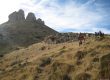 Ahora estamos pasando justamente por la parte más al sur del Peñagolosa. Deberíamos estar viendo sus impresionantes paredes sur mientras nos acercamos al collado del Cantal del Miquelet. Pero a partir de cierta altura todos son nubes grises y espesas. Al frente otra picuda montaña nos sorprende, ya que las nubes nos la dejan entrever observándole sus perfiles agrestes y atractivos: Es La Golosilla y seguido la Moleta de La Clocha; seguimiento hacía el sur del Peñagolosa.