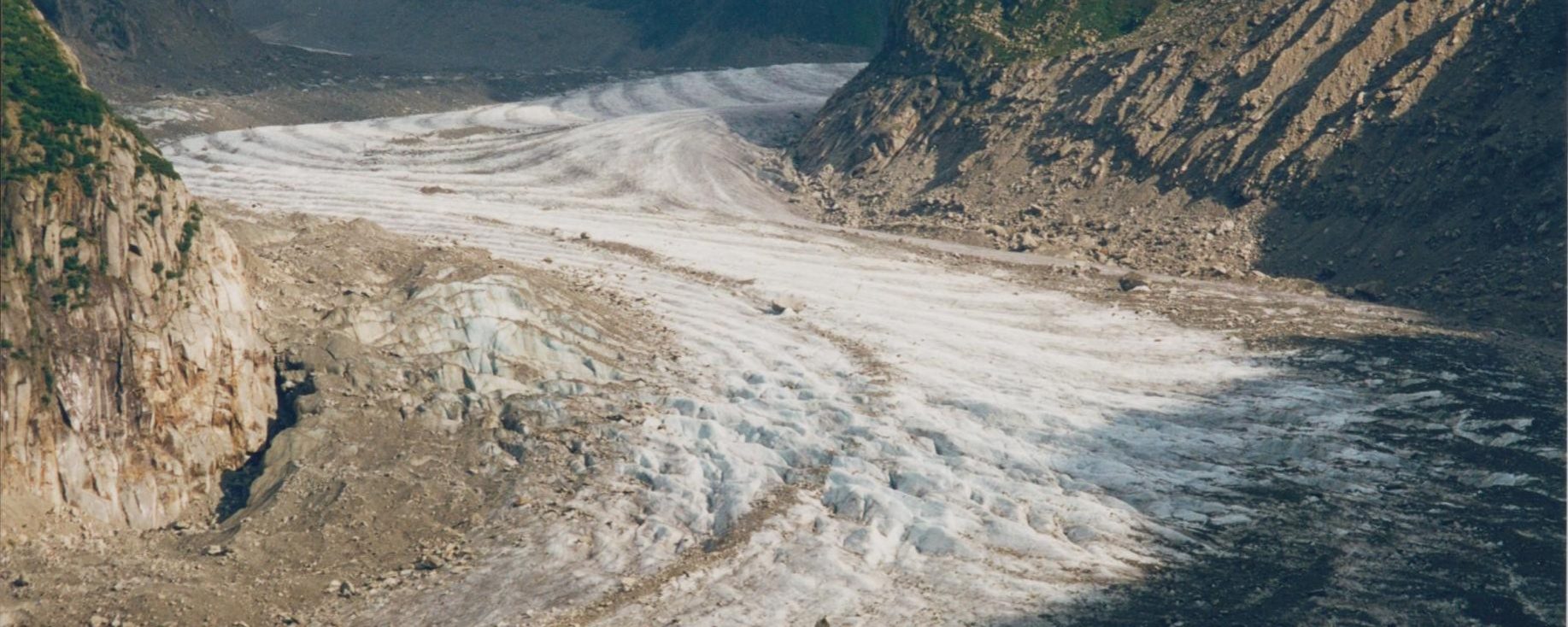Abajo, en el fondo del valle, nos sorprendemos por la imagen que tenemos ante nuestros ojos: es la Mer de Glace. Un gigantesco río serpenteante de hielo que recorre el fondo del valle y que se abre entre crestones y altas montañas. El glaciar parece que hace como olas por las arrugas que se forman por el movimiento del mismo glaciar. Grandes y pequeñas ondulaciones recorren el glaciar a lo ancho. El hielo de color blanco azulado se cubre en algunos sitios con tierra y piedras que lo embrutecen sobre todo en sus bordes junto a las rimayas. De vez en cuando alguna grieta aparece en el glaciar. Una de ellas la han aprovechado como cueva para introducir al turismo en ella y la vean desde dentro, sus formas y aspectos. ¡No me gustaría saber como es una grieta por dentro mientras camino por un glaciar! Un pequeño telecabina baja desde la estación y hotel de Montenvers a la cueva de hielo.