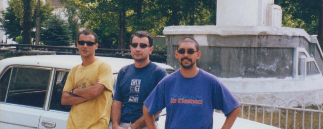 Bajo una estatua a Lenin en el Valle de Baksan, de izquierda a derecha: Jesús Andújar, Joaquín y Jesús Santana