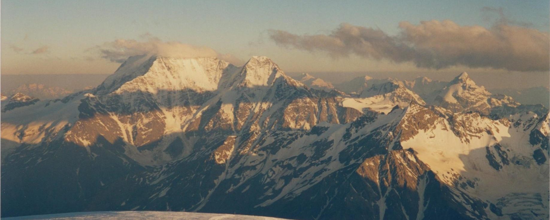 Salimos a +/- 15 h. para las Pastukhov Rocks a 4.700 mts. para aclimatarnos. Vamos despacio pero hacemos pocas paradas, en 2 h. y 30 minutos llegamos al límite de las fuerzas. Hacemos fotos impresionados por las vistas de los cuatromiles de la cordillera, Los Ushbá, el Donguzorum y cientos de picos. Al fondo descubrimos la impresionante doble mole de Los Ushbá, una impresionante montaña colmada de neveros, glaciares y vertientes vertiginosas con sus dos cumbres como gigantescos e infranqueables cuernos que arañan el cielo. Una montaña imponente y bella, muy bella. A esta altura el Caucaso se muestra ante nuestros ojos y se pierde de una vertiente a otra abarrotada de picos, valles, glaciares… perdiéndose a grandes distancias miráramos por donde miráramos. Claro está que al norte teníamos el propio Elbrus, y detrás de éste la planicie y Estepa Rusa, pero delante nuestro, hacía el este, oeste y sur la altiva y extensa cordillera del Caucaso. Una visión espectacular y soberbia; llegué a pensar que llegaba a ser más espectacular que Alpes, y en algunos aspectos es igual o más impresionante que la cordillera alpina. No hace frío pero si viento y eso se nota en los dedos. Hacemos una parada para contemplar el magnífico espectáculo y bajamos a Dizel Hut a las 18:30.