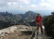 Llegamos a un cruce. Ya vamos a cruzar la sierra para bajar por el lado opuesto por el que andamos a la ida, al otro lado de las agujas cimeras de la misma. Pero vemos que Sant Jeroni queda a 25 minutos según el poste señalizador. Para lo que queda me atrevo a sugerir la conquista de éste en un sobreesfuerzo y carrera relámpago, después cogeríamos al grupo; nadie me sigue excepto David Luís. Y los dos corriendo por la reconocida senda pasamos junto a la Ermita de Sant Jeroni, admiramos y hacemos fotos de la sierra ya a más altura, y en poco tiempo subimos por las extenuadas escaleras que nos llevan a la cima y estupendo mirador del pico Sant Jeroni (1.236 mts.). El esfuerzo es recompensado por las admirables vistas y la inconfundible miel del éxito al llegar a una cumbre. A pesar de las nubes medias y altas (ya han desaparecido las bajas que cubrían las agujas), la visibilidad es extraordinaria; y bajo las negras nubes al noreste se divisan las montañas del Montnegre, El Corredor, Montseny… y más cercana Sant LLorenç del Munt y la Serra de l’Obac. Permanecemos poco tiempo en el mirador de la cima. Unas guiris (irlandesas o islandesas, según David Luís) nos hacen las fotos de cumbre, y yo me deleito al apuntar con mi cámara hacía casi todos los puntos cardinales. Extraordinario.