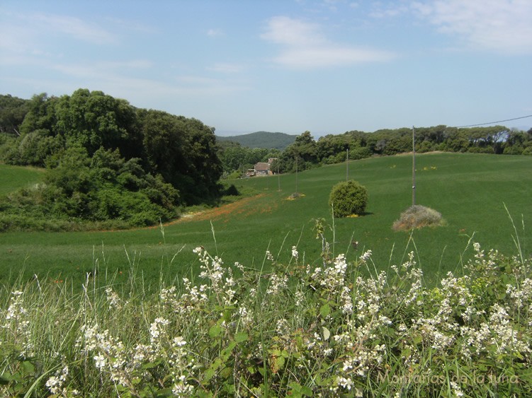 En un oxidado poste frente a este inequívoco pino aparece una marca del G.R.-92, puesta muy chapuceramente como si se tratara de una pintura ilegal. Hay que seguir hacía la izquierda y Norte por esta anchísima y monótona pista. Enseguida se interna en la urbanización de Sant Carles, a la vez que dejamos el Parque Natural de La Serralada Litoral. El G.R. sigue por una de las calles principales de la urbanización, donde me llamaran la atención algunas construcciones, casas de extravagante, llamativa y original construcción; como una casa suiza y una especie de castillo de estilo gaudiano. Chulos. En cuanto salgo de la urbanización por una pista asfaltada, enseguida el G.R. gira por una senda-camino de herradura, hacía la derecha y abajo. Enseguida, entre verdes bancales de amapolas y vistas a las boscosas laderas cercanas a La Torrassa del Moro, llegamos hasta la parte más alta de la carretera BV-5103. Ahora, entre otras indicaciones y recorridos, el G.R.-92 se dirige a La Torrassa del Moro, o simplemente La Torrassa. Así que cruzo la carretera al lado opuesto hacía Can Collet y la Casanova.