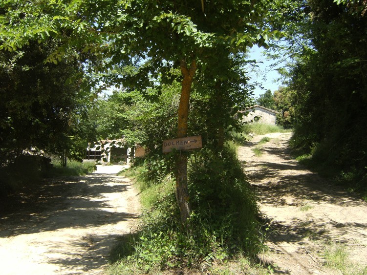 Cerca del cruce hacía Can Miloca descubro al fondo y arriba de la selva del bosque, la torre de vigilancia de incendios y el edificio del Santuario del Corredor. Magníficos lugares que hoy no visitaré. Poco antes veo como el G.R. vuelve a la pista, y es así como descubro la equivocación en el cruce anterior a Can Bosc. Enseguida la señalización de Ca l’Arenes y hacía la izquierda, bajo por un camino a la cercana masía. Justo en las puertas de la misma un cartelito simpático y sincero, nos indica el camino hacía el Dolmen de Ca l’Arenes. ¡¡Por fin dejo la pista machacante, fatigosa y polvorienta!! para seguir por sendas y caminos de herradura que recorren, ahora, bosques de encinares, quejigos, sureres… frondosos, de fresca sombra y húmedo terreno, verdes, vivos y magníficos. Muy reconfortante a estas horas del día en que el sol y al calor son más insistentes.