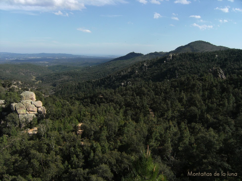 Los compañeros no se lo piensan y se tumban, de cuerpo entero, sobre la rojiza piedra del terrado-mirador que mira hacía el sur. Un breve cerrar de ojos y el sueño y la calma invade tu cuerpo en este lugar apartado de la tierra y más cerca del cielo. Curioseamos por el lugar. No paramos de hacer fotos y de intentar reconocer lugares en lontananza: se ve justo en frente un trozo de costa y ciudades muy próximas: Lloret de Mar y Blanes pensamos podrían ser; a su izquierda y norte las montañas de Les Gavarres, sobre Cassà de La Selva, y más arriba casi medio escondida, la propia Girona. A la derecha del mar y sur, las montañas del Montnegre, y más al sur los bosques de, aunque parece que lejanas, laderas del Montseny, con su formidable y espectacular Les Agudes omnipresente y señorial dominando su feudo de verdor y frondosidad. Hermoso.