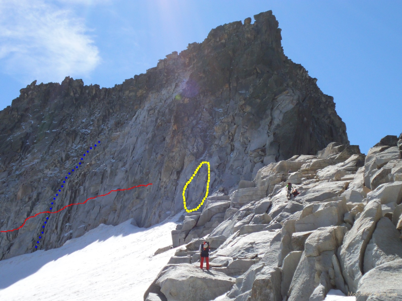 Puntos azules: Supuesta subida de Pep hace 10 años. Línea roja: Supuesto límite del glaciar o nevero en la pared hace 10 años. Línea discontinua amarilla: Supuesta parte de la pared por donde intentemos la escalada al Pico Maldito.