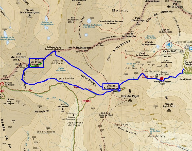 La verdadera intención de esta salida era hacer el Pic de l’Infern (2.851 mts.) por el corredor de su cara norte, y al final terminamos realizando la subida al inhiesto Pic de Freser.