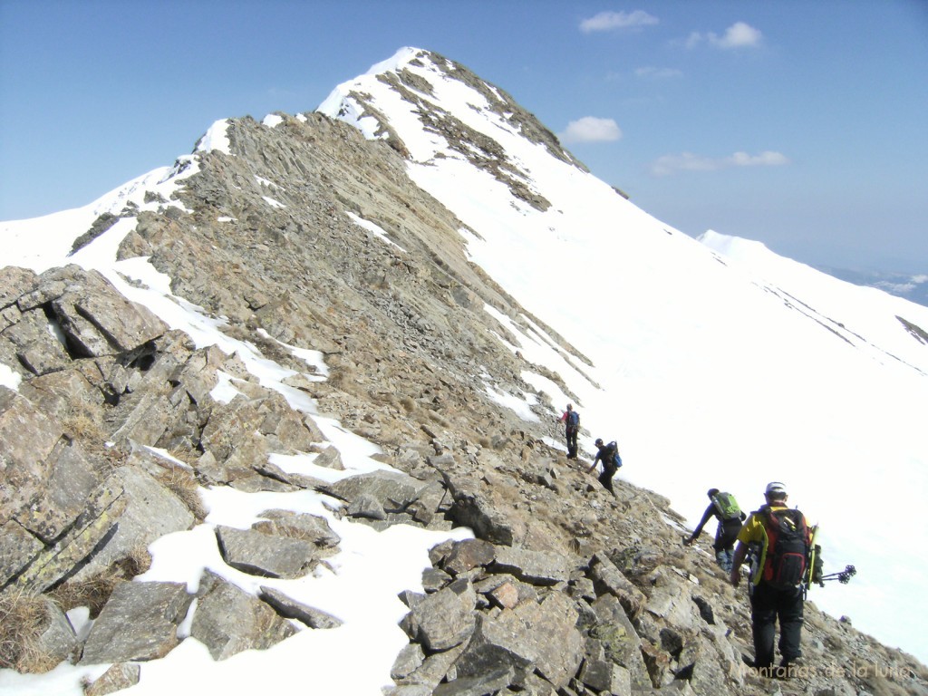 En muy poco tiempo y sin pérdida giramos hacía el este por, al principio debajo de la cresta en la cara sur, y después por la misma cima de la cresta, donde las cornisas y la temperatura del día te hacía suponer una fragilidad de las mismas importante. “Hay que ponerse crampones”. Parece que debemos pasar una placa de hielo, pero que al final es el color o mancha de la propia nieve, no es hielo. Sin problemas llegamos a la cima del Pic de Freser (2.835 mts.). Pensábamos en la modestia del pico abrumado por la fama del Pic de l’Infern, pero nos dimos cuenta que era una montaña que bien merecía una visita o una jornada solo para ella también, a pesar de la cercanía del Infern. Una cumbre casi puntiaguda y una cara norte alucinante. Lo que parecía un Pirineo de suaves lomas y fáciles pendientes, nos descubre ahora esos desconocidos o menos visibles rincones abruptos, escarpados y hermosos, de la alta montaña pirenaica gironina. Fotos, celebraciones y enhorabuenas. Al final el Freser se convierte en un pico que nos ha sorprendido y no nos ha decepcionado. Hermano pequeño (no demasiado, pensábamos que medía menos altura) del Infern, le hace sombra y quita visión y protagonismo desde el mismo Coll de La Marrana. Las vistas al Pirineo son excelentes: desde el mismo Canigó hasta las montañas andorranas al otro lado de La Cerdanya francesa.