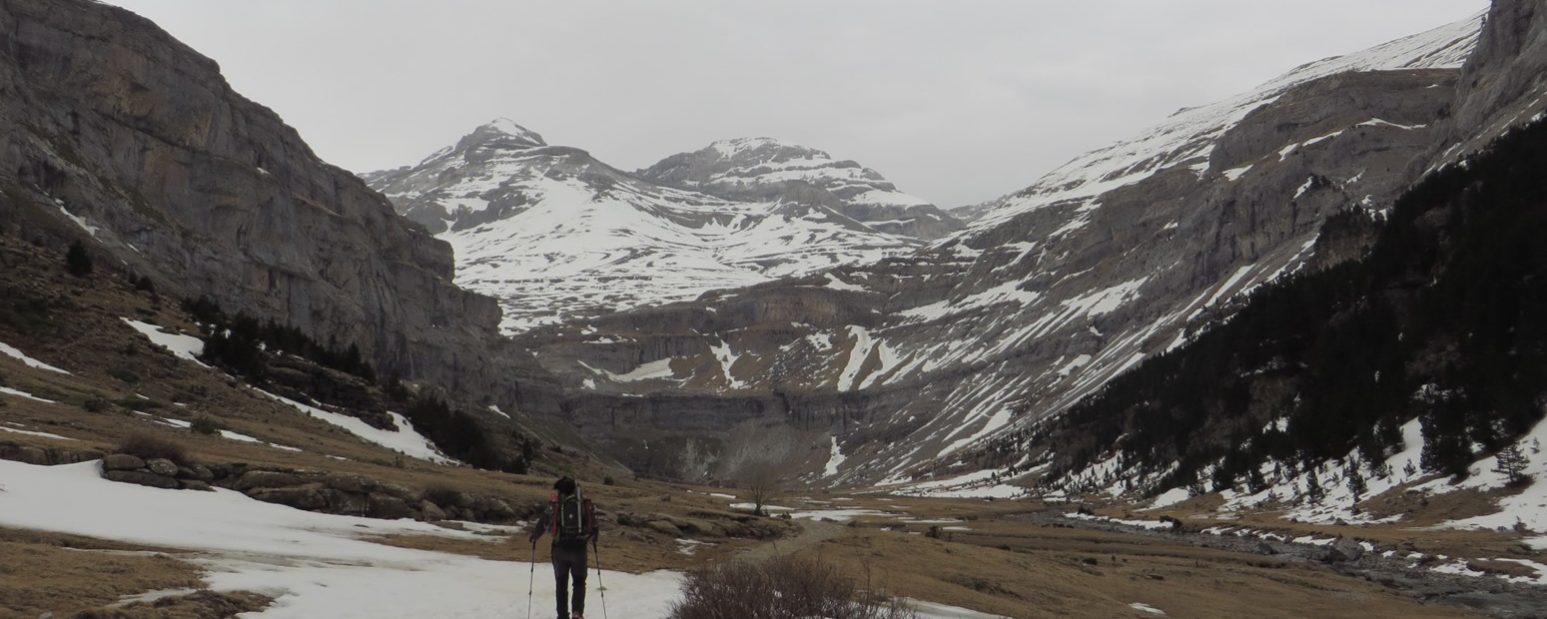 Josep y yo llegamos al parking del Valle de Ordesa el mismo viernes 20 con la intención de que en lo que queda de día subir a Góriz. Han sido unas 4 horas poco más desde Barcelona de coche, y ahora toca cargarse el mochilón y caminar valle arriba hacía el mencionado refugio. El tiempo está un poco raro: nublado pero no precipita, el frio no es intenso y la nieve es escasa; parece haber sufrido una fusión prematura estos días pasados, ya que nos encontramos a la lo largo del camino neveros en hoyas y lugares donde se suele acumular, y limpio en el resto.