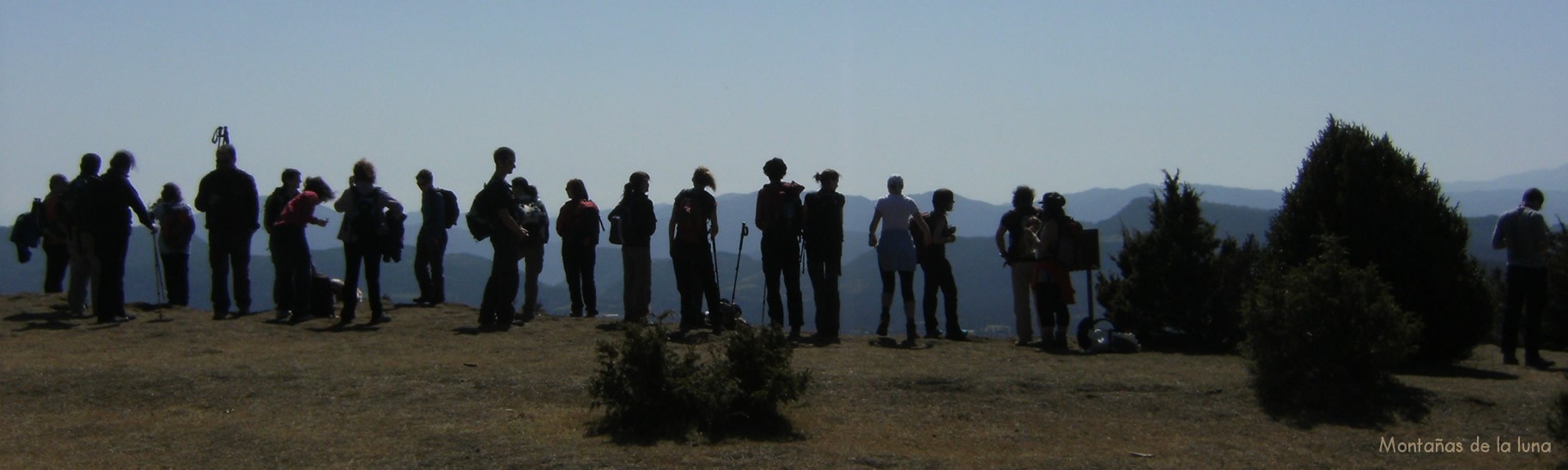 Le damos la vuelta al edificio, amplio edificio, y nos paramos ante su puerta y su “rectoría” (nuevo nombre para un bar). Hay bancos, lugar para esparcirse y más gente que disfruta con el medieval lugar. Es encantador. Hermoso a su manera; como cualquier edificio antiguo perdido en la escarpada montaña. Decidimos apartarnos un poco del lugar, los Cuspidianos, para comer en la misma cima de la roca, en la misma cima de la sierra, donde un eje geodésico y un señalizador mirador, nos indican lo más alto del lugar (menos el cercano Cap del Pla del Prat a 1.312 mts.): estamos en el pico con el mismo nombre de la sierra y santuario: Cabrera; a 1.306 mts. de altitud. Para llegar a él hay que cruzar un anchote pasillo cimero y llano de roca; por el que se asoman fuertes y vertiginosas vertientes a cada lado. Una baranda metálica señala el lugar de un mirador; donde se observa ese Pirineo nevado, Sierra del Cadí, Pedraforca y otras que aún no he aprendido. Delante Bellmunt, pequeña visión ahora desde aquí, pero encrespado y reconocible por su santuario encaramado a la escarpada cumbre. Hermoso paisaje del Prepirineo barcelonés y gironés.