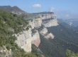 Ahora comienza la verdadera subida a la Sierra de Cabrera. Somos tantos subiendo por una única, desgastada, empinada y estrecha senda, que las colas y las esperas se hacen común en esta primera subida. Parecemos un ejército invadiendo un territorio… salvo que algunos se lo toman con más calma. Al final, después de escalones y pasos resbaladizos en pendientes escabrosas, llegamos a la loma cimera de la carena por la que estamos siguiendo para llegar a la cumbre de la sierra. Y aquí una agujita de roca, nos hace contornearla por la derecha para llegar a un pasillo de roca, muy ancho pero espectacular junto a una pared, que nos sube, en poco tiempo, a la loma principal de la sierra. El balcón nos ofrece una vista y una imagen preciosa: parte de los Pirineos nevados con la Sierra del Cadí y Pedraforca muy reconocibles, y más delante el cimero santuario de Bellmunt y su cortante cresta, entre otros lugares… hermoso paisaje. La gente sube y sube, como si no termináramos de llegar todos al lugar; a la vez hay otra gente, familias, que suben por su cuenta, parece una sierra muy visitada. Pronto, entre hayedos magníficos, en una pendiente más suave, y entre la conversación con Piki llegamos a un claro pasando grandes árboles prácticamente en la cima de la sierra y junto a las cercanías de otra gran construcción, masía abandonada, con uno de sus muros en el suelo: estamos en las cercanías del Pla d’Aíats. Aquí, los menos acostumbrados a estos esfuerzos montañeros, deciden sentarse a descansar sin apelar al guía y organizador. Pero en poco tiempo debemos seguir hasta uno de los espectaculares vértices de la sierra, objetivo de la actividad, mirador excepcional.