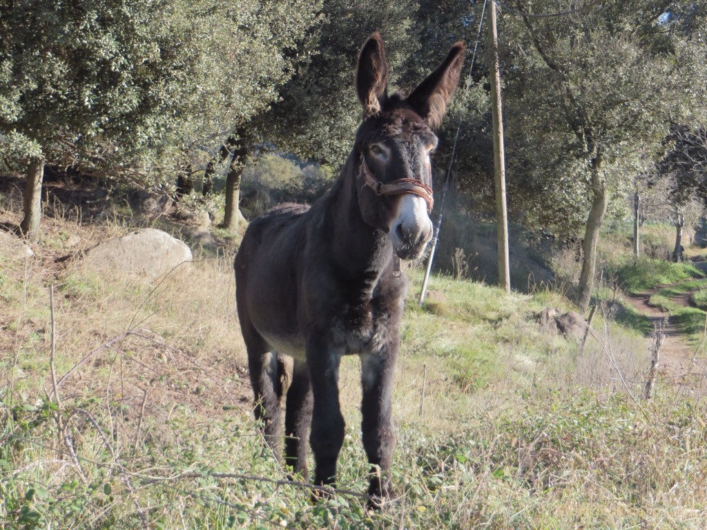 El camino sigue recto mientras dejamos Santa Pau ya casi invisible al otro lado del vallecillo, y más al fondo y sur, la magnífica y hermosa Sierra de Les Finestres. El camino llega hasta las faldas de la montaña; a la izquierda aparece una gran vaquería, la cual no aparece en el mapa Alpina… debe de ser una construcción muy nueva. Estamos en un cruce, y decido seguir recto y hacia el norte, noreste, por un camino menos transitado. Justo aquí nos saluda un precioso burrito catalán que intenta seguirnos y acercarse simpáticamente a nosotros. A la derecha dejamos Les Tries y subimos por el camino en busca de La Terrada, grandes masías y construcciones típicas del campo catalán.