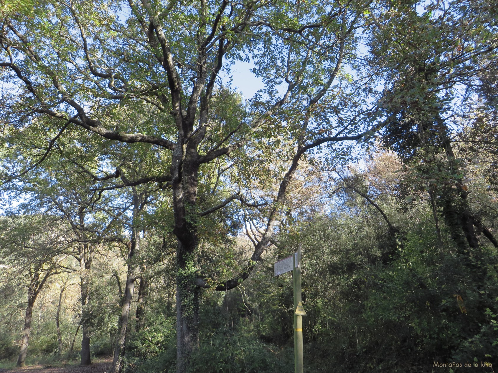 Mientras el camino se adentra en la montaña, pasamos por otro cruce en medio de unos hermosos ejemplares de robles. Un cartel indicador de recorridos: vamos bien, hacía el Coll de Boixedes. El camino más arriba se convierte en senda, y deja de atravesar bosque espeso para cruzar por otro menos espeso y hasta de matorrales altos, más abierto y despejado, por suerte la senda está marcada y el recorrido, aún por las partes más estrechas de la senda casi comidos por el alto matorral, es inconfundible. Tras un zigzag llegamos a una explanada en la cima de la montaña. Estamos en el Coll de Boixedes.