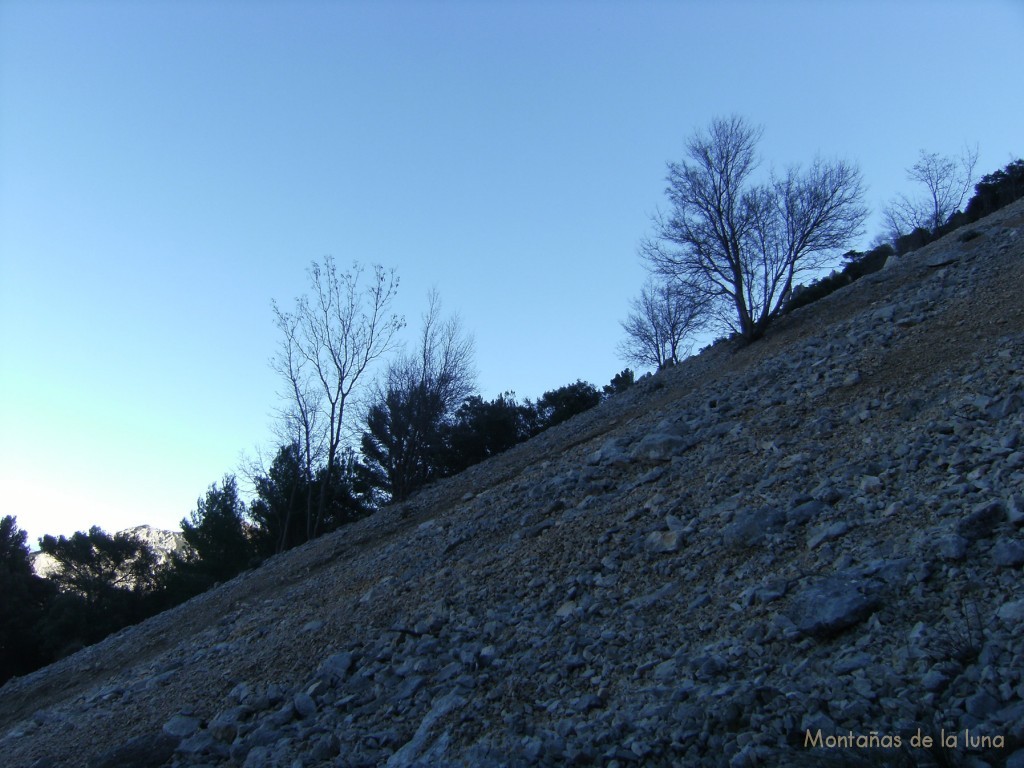 Son verdaderos pasillos entre la agreste montaña que, con un zigzag, nos llevaran, por su sombra, hasta el nombrado collado. A la vez el horizonte hacía el norte se agranda: Sierra Aitana se ve más enorme y magnífica, y el terreno allá abajo más alejado y profundo.