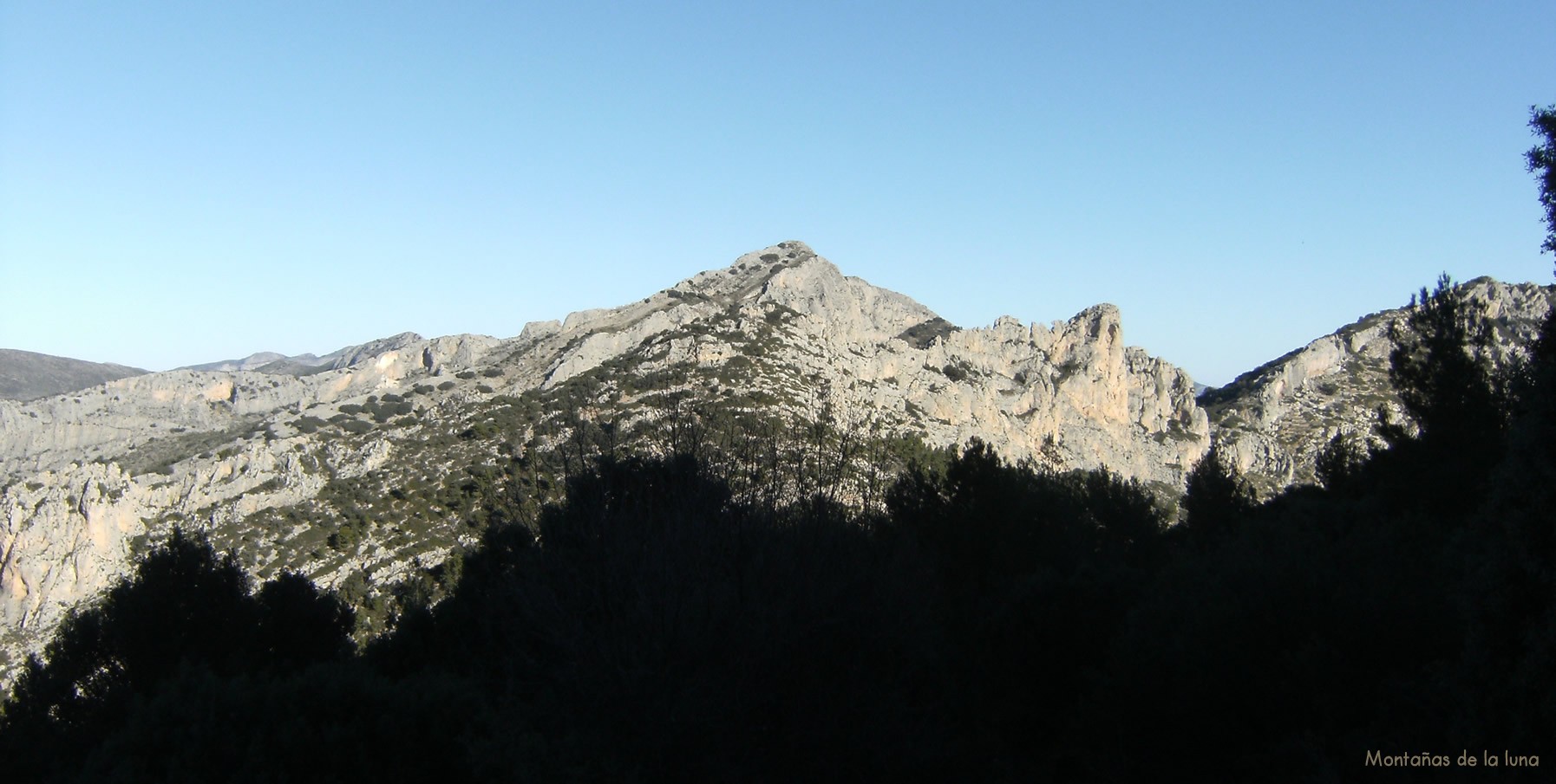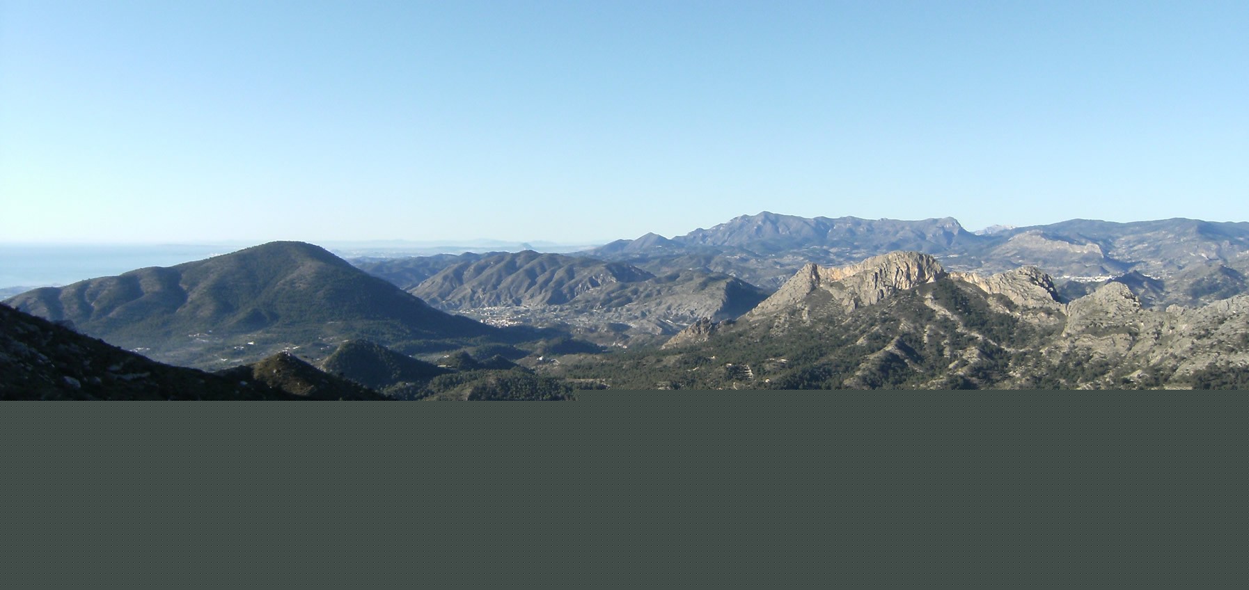 Sierra Aitana, delante de ésta a la izquierda el Alto de la Peña de Sella, en el centro el Peñón Divino, y abajo la cresta de Castellets