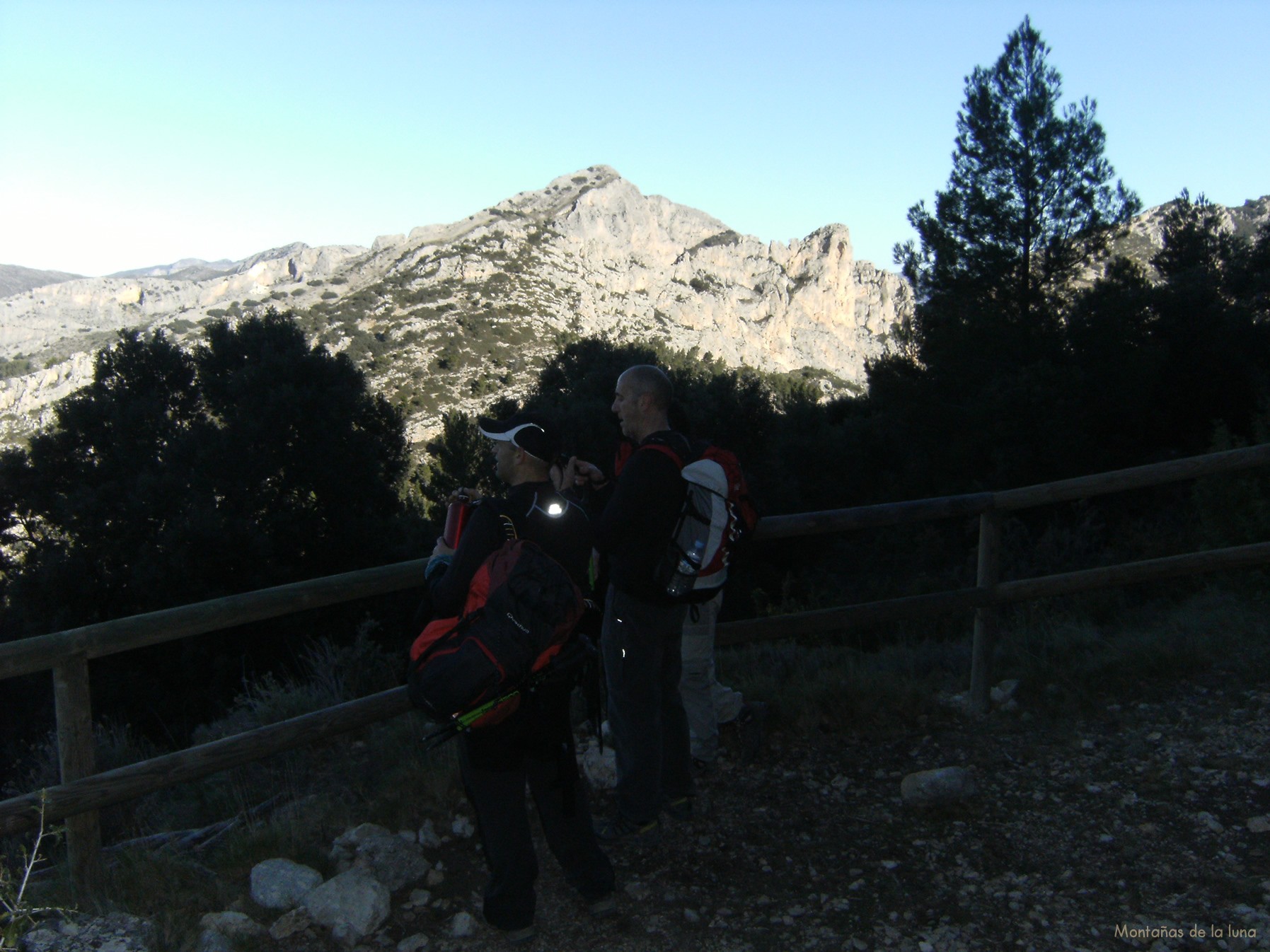 Llegamos a Finestrat. El “Fí d’Estat” de un antiguo reino. Desde casi su carretera principal que cruza el pueblo de este a oeste, junto a un semáforo, sube una estrecha y angosta calle o camino que, saliéndose del pueblo y pegado a las casas de su vera, nos deja en el famoso rincón de la Font del Molí, donde aparcamos y emprenderemos la marcha. Abrazos, saludos y presentaciones. Miramos al día y a la montaña. Espléndidos los dos. Una imagen sobrecogedora e impresionante del Puig Campana, con su pared suroeste inquietante, gigantesca, interponiendo su cima a la verdadera cumbre de la derecha. Un efecto óptico peculiar. Desde esta primera visión bajo su imagen y frente a ella, ya vas dándote cuenta que es una montaña que guarda una magia y belleza única.