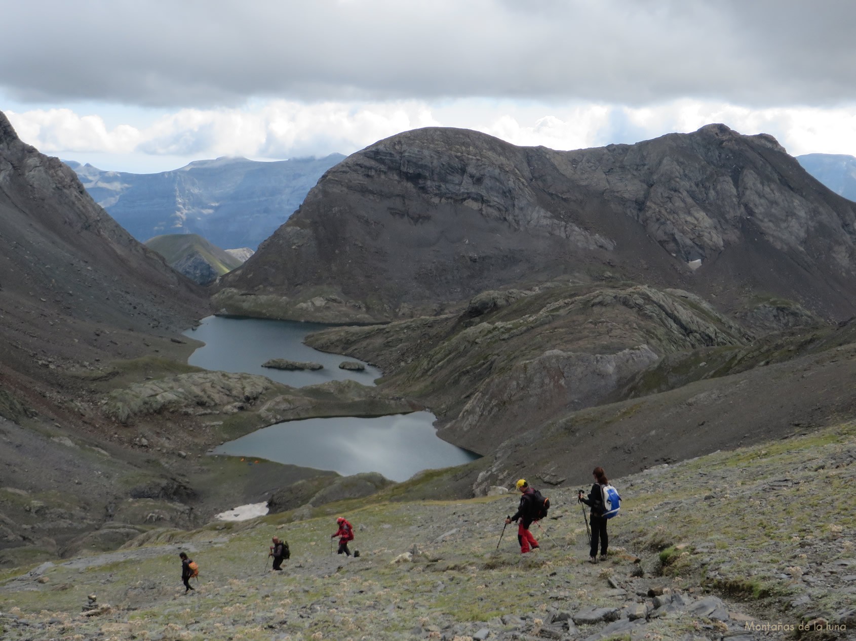 La senda no tiene pérdida. Está muy marcada y es fácil de seguir mientras subimos altura y surcamos las pedregosas y rocosas laderas de La Munia. De vez en cuando miro hacia la derecha como intentando encontrar la senda que sale en el mapa Alpina y te lleva hasta los escarpes del Robiñera. Pero no hay manera. No llego a verla, no la encuentro… ¿de verdad existirá dicha senda? De mientras el paisaje se va abriendo y agrandando: la visión protagonizada por los lagos es impresionante, hermosa y única. De repente aparece unas montañas nevadas y colmadas de hielos: es el Soum de Ramond y Monte Perdido que se asoman por unos instantes hacía el este. El Robiñera aparece como un verdadero pico alpino, escarpado, infranqueable, altivo y soberbio. Muy llamativo y hermoso. No veo manera de subirlo desde este lado. Menos mal que no llegamos a acampar en su base antes del Collado de la Puerta.