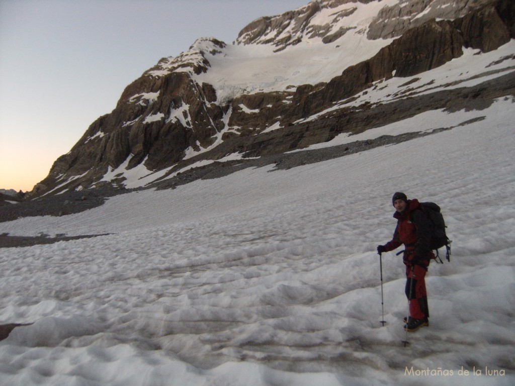 Manolet va delante de mí. Y la visión de estar por debajo de esas enormes masas de hielo de la terminación del glaciar, hace que agilices tus pasos hacía la Canal, la Primera Canal.