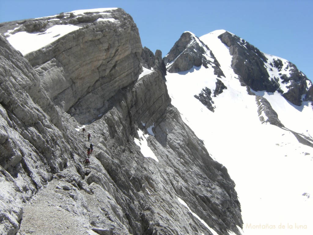 No quiero, no debo, no puedo mirar hacía atrás, hacía abajo, y me concentro en la subida. Más arriba es fácil y paso a la nieve de la canal, ya por fin, a la derecha. He tardado mucho en realizar este paso, pero tiempo necesario por la exposición y peligrosidad, y una mortal y eventual caída. Manolet ha ido mirando a ver si salía de la Segunda Canal, ya que este paso está muy cerca del final de la Segunda Canal y por tanto de la salida de la vía norte clásica.