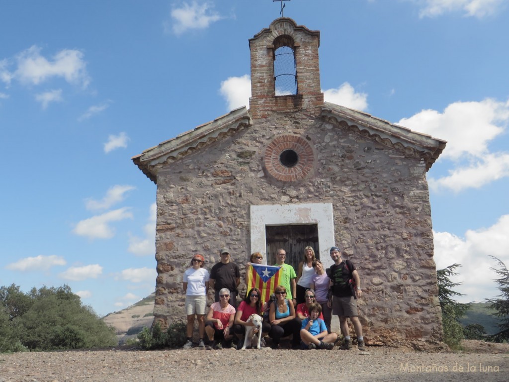 Al llegar a la altura del edificio de La Mata (pero al otro lado de la ladera de la montaña, sin verlo) decidimos subir, por una senda a la derecha a la Ermita de Sant Jaume y así hicimos para, al menos, hacernos la foto de grupo. Desde aquí las vistas son dignas de mencionar, por su altura parece un magnífico mirador: vemos abajo el vasto edificio de La Mata, hacia el norte el Montcau con su inconfundible perfil de pagoda… hay gente en su cima, como siempre. Las nubes bajas se han convertido en nubes más altas y algodonosas, que dejan un paisaje pintoresco y extraordinario.