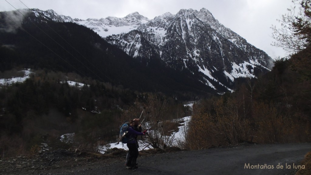No hay pérdida. Seguimos el camino y una vez llegados al parking y cruzado el Puente de Resséc, las indicaciones hacía La Restanca son inconfundibles. A partir de aquí la nieve va a ser muy abundante, el valle se cierra hermoso y casi boscoso, mientras rodeamos los pilares oeste del Montardo. Un grupito de franceses con sus esquíes nos pisan los talones y nos adelantan. El valle se cierra y enfrente nuestro vemos el Tossau de Mar, muy cerca a nuestra derecha queda el Arriu de Rius. Pero el tiempo comienza a cerrarse y encapotarse amenazadoramente de nuevo… a ver si nos da tiempo a llegar al refugio antes de que descargue.