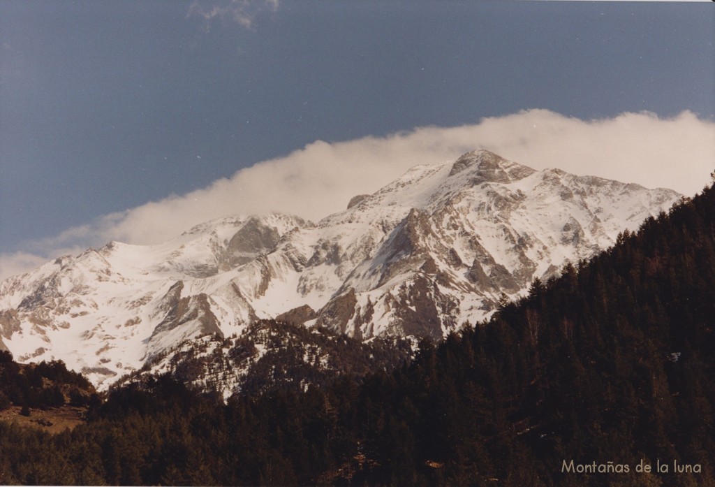 A medida que seguíamos valle arriba nos internábamos en lugares rodeados de bosques y abundante vegetación, al igual que prados de amarilla hierba agostada por el frío. Una montaña nevada a nuestra izquierda nos llama la atención, es el Punta Suelza de casi tres mil metros; montaña que no dejaríamos de ver en la subida al Posets. Verdaderamente altiva, llamativa y sobresaliente sobre todas las demás. Al poco rato y después de franquear una boscosa ladera a la derecha, aparece indómito, espectacular y agreste el macizo del Posets, con sus picos más altos nevados por todas sus agrestes y verticales laderas, y coronados por una nubecilla blanca que rozaba la cumbre de este extraordinario pico.