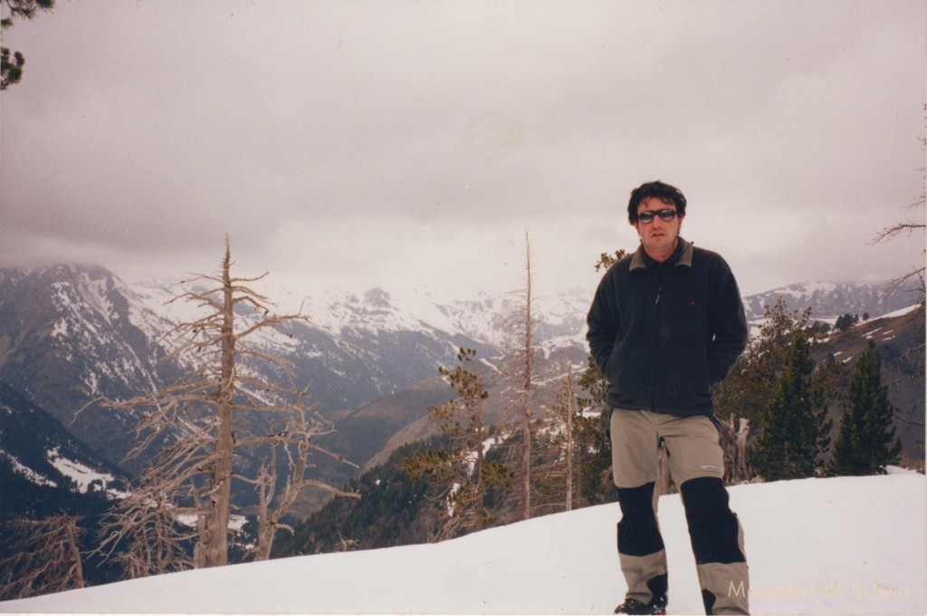 Más arriba aún, la abundante nieve y la pérdida de la verdadera senda nos hizo pararnos en una especie de mirador, en un montículo sin árboles en medio del bosque casi en las faldas de las abruptas laderas de Las Espadas y Tuca de Llardaneta. Ya habíamos andado bastante y el camino a seguir se hacía más difícil por la abundante y blanda nieve. Hacía el norte-noroeste el paisaje lo protagonizaba el cubierto pico El Montó rodeado de tupidos bosques que llegaban desde donde estábamos nosotros hasta sus faldas, cubriendo todo lo que veíamos del valle. Más detrás, las peladas y nevosas laderas suaves de las montañas cercanas, además, a la frontera con Francia, nos decían que eran las precedentes a las altas cumbres que superaban o se acercaban a los tres mil metros. Unos viejos, altos y secos pinos adornaban esta ventana al Pirineo, al paraíso de nieve, soledad, frío, roca y vida.