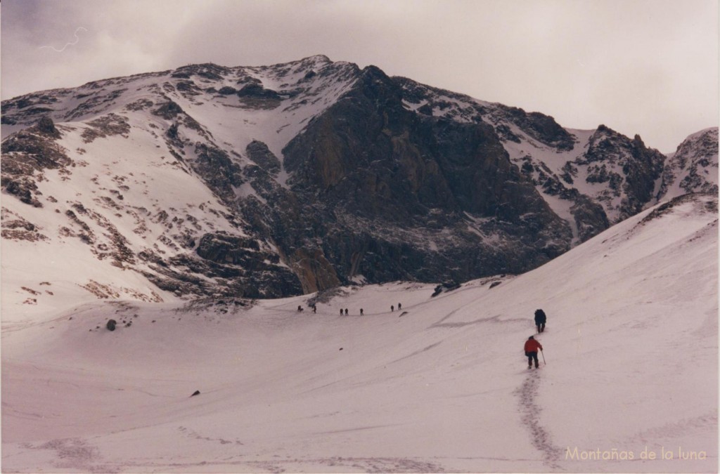 Más arriba llegamos a una especie de plataforma algo horizontal y cóncava hacía abajo como el lecho de una pequeña lagunilla. Desde aquí un respiro en el marcado sendero de huellas en la nieve. Ante nosotros veíamos de nuevo el Posets, el pico, la cúspide sobre su espectacular pared noroeste oeste y sus perfiles abruptos y agrestes. Podíamos observar a la gente que cruzaba, casi en el aire, la cresta cimera para llegar a lo más alto del Posets. Daba vértigo nada más verlos allá arriba, como suspendidos en el aire y enderezados por una extraña fuerza de equilibrio. Hacía el norte podíamos observar el otro cercano macizo de tres miles que tenía Viadós; el Bachimala con sus agrestes crestas y espolones de la Punta del Sabre, y al fondo, más alejado, el Culfreda en la frontera con Francia.