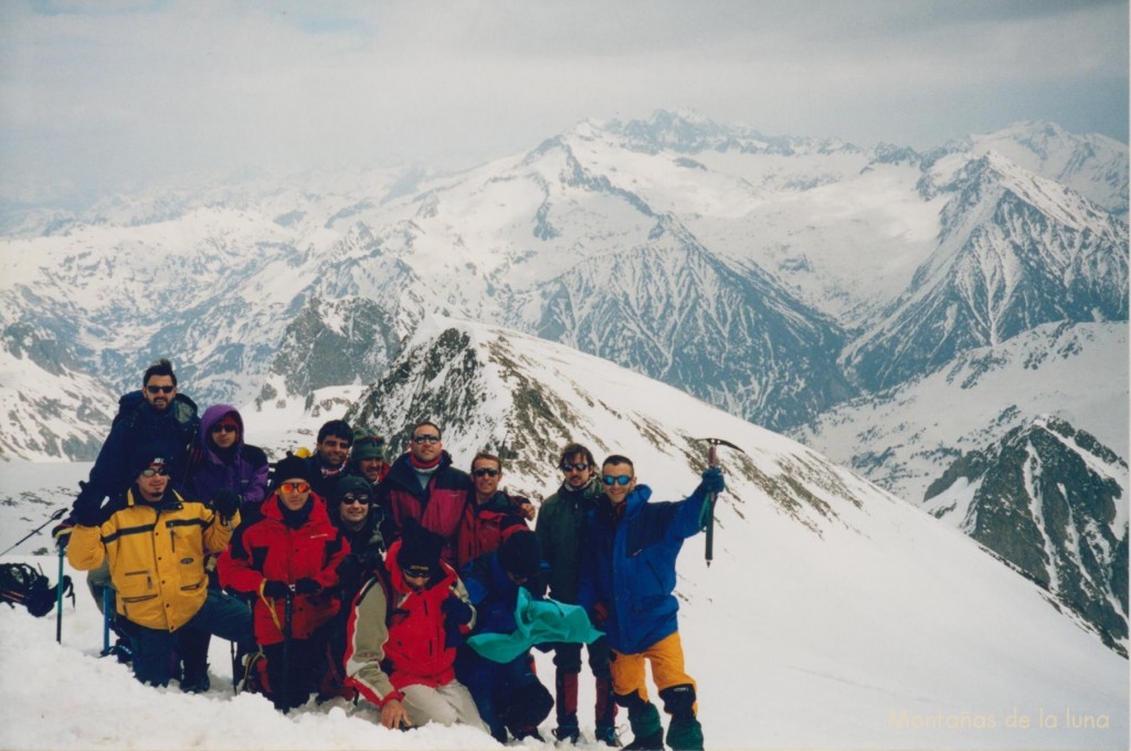 Estamos casi en el centro del Pirineo y el paisaje es soberbio. Puede que sea muy repetitivo al expresar y manifestar con estas letras lo experimentado y visto, pero no me cansaré de recordar y ver aquellas fotos hechas a la infinidad blanqui-negra de aquellos Pirineos invernales y fríos: Montes Malditos, alto Valle de Benasque, Pirineo francés, montañas del Valle de Arán, resto del macizo del Perdiguero, el cercano y espectacular macizo del Posets al sur, macizo del Bachimala, macizo de La Munia, macizo del Pic Long y Neouville, y al fondo, casi inapreciable si no sabes reconocer sus característicos perfiles, el macizo de Las Tres Sorores, Monte Perdido y compañía. Todo iluminado por la blancura y luz de la nieve, por las manchas de rayos de sol de aquí y de allá que aprovechaban esos espacios entre las nubes para introducirse en este mundo frío pero a la vez bellísimo. Raras veces he visto y veré el Pirineo como en aquella ocasión. Un verdadero lujo para un pirineista inhabitual.