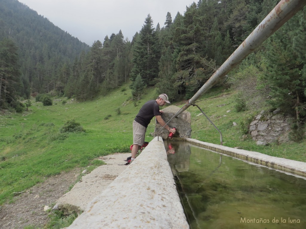 De repente descubro un claro del vallecillo mientras bajo, y un alargado abrevadero: es la Font de La Coma. Miro el mapa al llegar al lugar. Voy muy bien. Lleno mi cantimplora y echo un vistazo atrás mía, al formidable bosque de la Sierra de Moixeró. Bello, vivo e impresionante. La soledad de mi recorrido la hace más formidable aún, como un explorador que descubre por primera vez el Paraíso Perdido ¡Muy hermoso!
