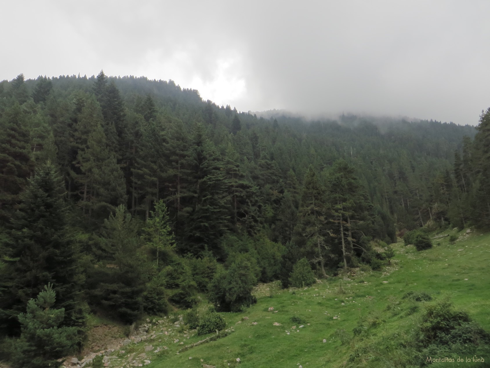 El tiempo está muy nublado, pero las nubes están metidas entre las laderas, las montañas, los impresionantes bosques; también están en las alturas, con amenazas de que esta tarde haya tormenta, lluvia. Estas nubes serán las protagonistas en toda la actividad, en todo el día. Pero me impresiono, me sorprendo genialmente con la Sierra de Moixeró, con las numerosas laderas y rincones de estas encantadoras montañas, son impresionantes bosques de altos y numerosos pinos, frondosos y con ese color verde oscuro increíble. Muy pirenaico, muy montañoso, perfecto y hermoso.