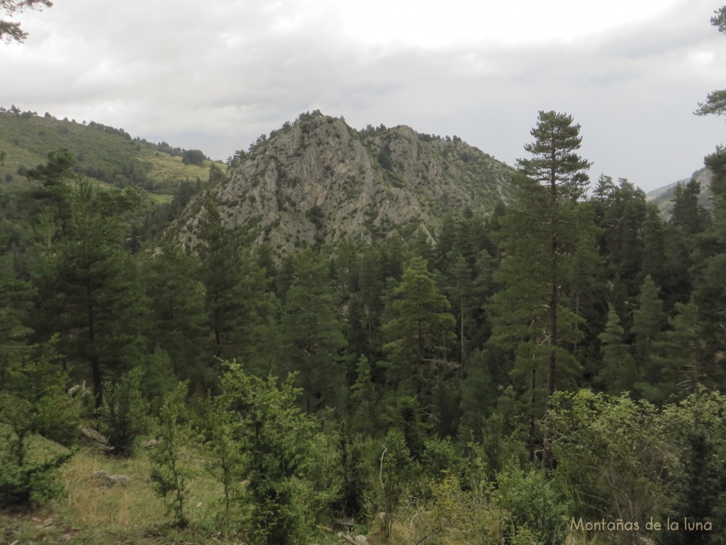 Al principio la bajada es fácil por en medio de los prados en la parte más alta del vallecillo. La niebla va desapareciendo y quedándose atrás, en el cordal cimero. Pero al llegar hasta los pinos indicadores que comienza el bosque y donde comienza a bajar y estrecharse el valle, tampoco hay camino o senda alguna; tengo que seguir las huellas y “sendillas” que deja el ganado por las laderas y no alejarme demasiado del fondo del barranco. Así, entre la soledad (más aún) de este bosque, de este valle de la Sierra de Moixeró, voy bajando casi monte a través sin senda apreciable o camino que se precie. Pierdo más tiempo de lo habitual en esta bajada, es normal entretenerse entre los pinos y bosques verticales si no encuentras senda que guíe tus pasos.