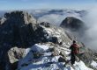 Marcas rojas y blancas en algún tronco de estos estupendos pinos, y más delante la espesa niebla en mitad de un prado desde el que provienen unas voces; son de dos montañeras las cuales se extrañan al emerger de la misma niebla y ver como las inmortalizaba en mitad del escenario blanco. Justo detrás un cartel señalizador, un cruce de recorridos, es el Collet del Raset (2.059 mts.) desde aquí sigue sin haber pérdida: seguir las marcas de G.R. entre las laderas empinadas, boscosas, inmersas en la espesa niebla o libres y despejadas. Hay un punto en que parece hay dos sendas: una sigue a la derecha sin subir, y la otra parece más desmenuzada que sube de frente. Hay que seguir la que sube, ya que la de la derecha (que es la que seguí) a pesar de su buen aspecto, acaba en unas paredes y escarpes desde los cuales tienes que girar pendiente arriba y encontrar la anterior. Hay algunos pasos fáciles pero interesantes de roca que le dan a la subida de estos míticos picos un aliciente y característica algo más peculiar y casi abrupta.