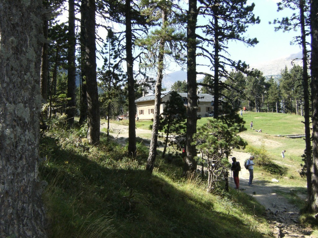 No hemos sido los primeros del numeroso grupo en bajar pero llegamos en muy poco tiempo al refugio, adelantando a otro numeroso gentío ¡¡Esto es La Rambla!! Hemos tardado la friolera de hora y media en bajar, aún con el pedregal hecho una m… Atravesamos los bosques de la parte oeste del Pedraforca. Hermosos y altivos árboles que aún conservan un verdor especial al final del verano. Bellos lugares.