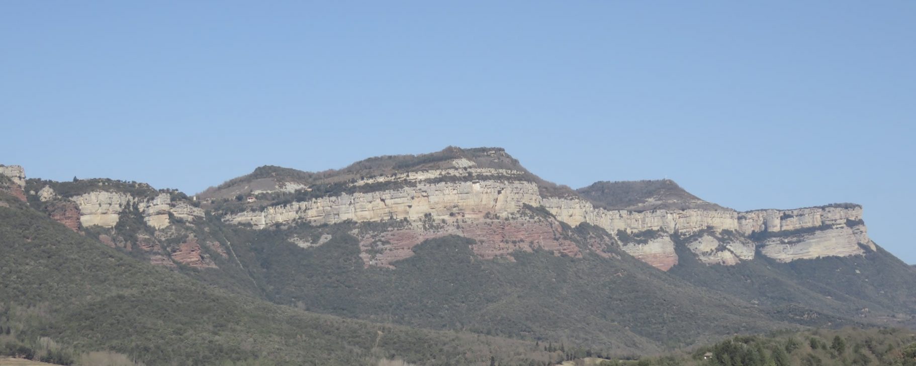 Al tiempo en la bajada por esta nueva senda que parece quiera coger dirección Tavertet (es solo la apariencia), llega a cruzarse con una senda más ancha y señalada con marcas blancas y rojas: es el G.R. de nuevo. Así que giro hacia la derecha y bajada, sur, suroeste, al encuentro del camino y carreterilla asfaltada antes recorridas en la subida. Voy dejando a mis espaldas la imagen espectacular y agujereada de las paredes de los Cingles de Tavertet. Parece un trozo de un gigantesco queso Gruyere de dos colores. Pero es un paisaje espectacular y magnífico.