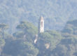 Llegamos a la cima del montecillo donde en cuya cima se yergue el reconocible dolmen de Pedra Gentil. Subimos como si fuera por escalones entre las raíces de los pinos hasta llegar a la construcción megalítica. Fotos nocturnas y sacamos la cena. Justo en ese momento comienza a llover de nuevo con algo de fuerza, y nos refugiamos en el interior del dolmen con un techo de roca con goteras. Antes y como otras veces que hemos estado aquí, le he hecho unas fotos al campanario de la Iglesia de Santa Eulalia de Tapioles que sobresale entre las copas de los pinos del denso bosque; siniestra, solitaria y casi pavorosa con un fondo rojizo, oscuro del mismo ocaso y atardecer del día. Inquietante.