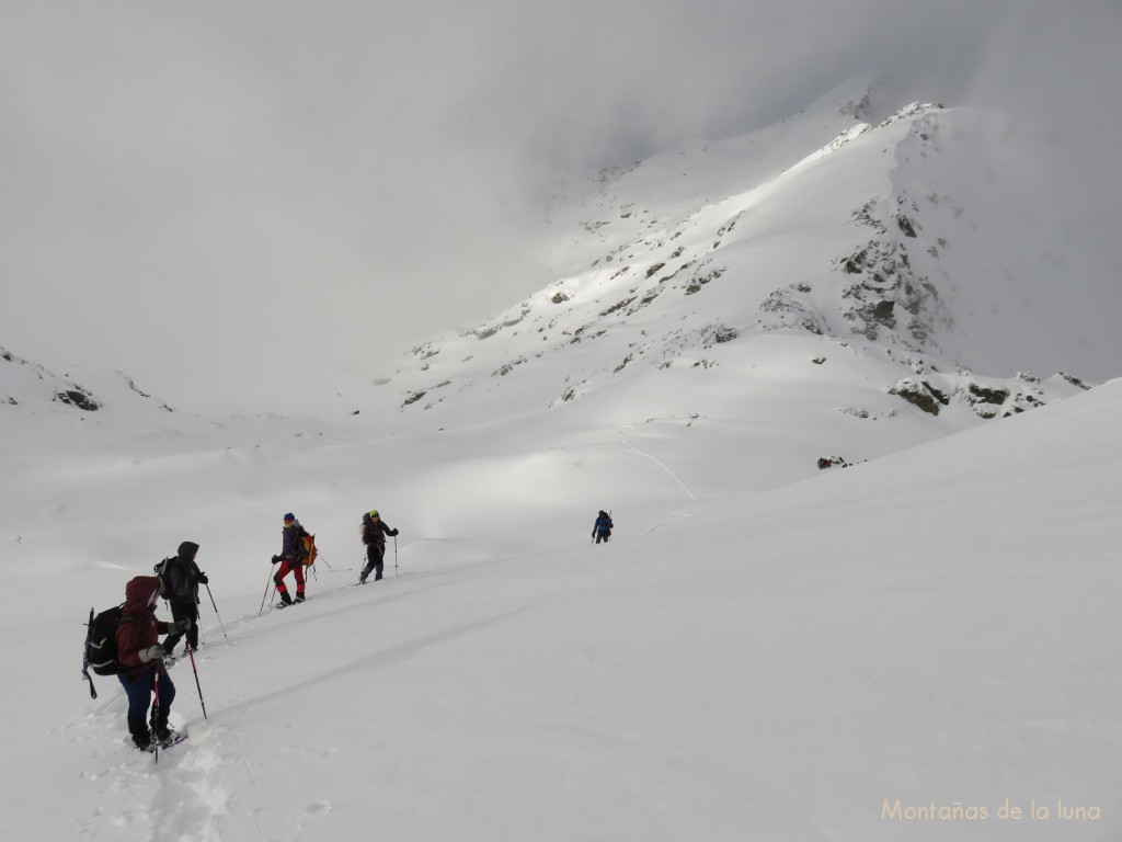 Pero una vez estábamos todos en el colladito junto al Montardo Petit, el resto de compañeros lo vieron claro y la subida al Montardo estaba a escasos minutos siguiendo la ladera norte del Montardo Petit hasta el cercano Coll de Montardo hacia el noroeste. Y desde el mismo collado que lleva el nombre de la montaña, la subida por pendientes medio heladas, más verticales y con mucha nieve (en un trocito nos tuvimos que volver a poner los crampones por seguridad, las raquetas no agarraban) se llega a la cima de esta emblemática montaña del Pirineo, del Valle de Arán. A la derecha, abajo y noreste se abría un suave valle (suave en el fondo pero de laderas verticales) con mucha nieve, en el que se encontraría las Basses del Montardo y seguidamente el Circo de Montardo. Las nubes nos impiden ver el paisaje en la subida hacia la izquierda. Lea y Flora han aprovechado que hemos pasado justo por la base y más factible ladera norte del Montardo Petit para subir éste. Y mientras el resto del grupo llegábamos a la cima del Montardo y comenzaban a bajar, éstos dos llegaban al punto más alto de la montaña.