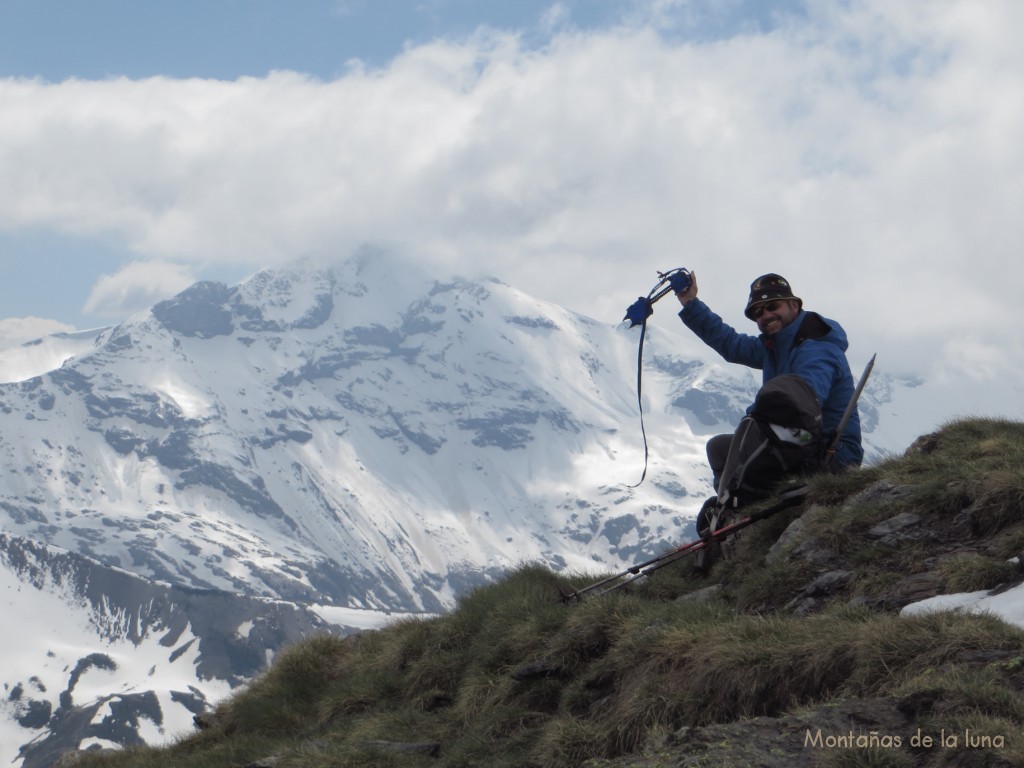 La imagen es impresionante: enfrente nuestro mientras avanzamos por la larga loma, el Gran Bachimala a la izquierda y la Punta Sabre a la derecha, entre ambos una especie de circo y nieve abundante en sus alturas. Pero siempre las nubes que no se separan de sus cimas y alta cresta. Hermoso e impresionante a la vez. Una ventana de buen tiempo y el sol nos ilumina con su intensa luz, pero no hace calor, más bien fresco o casi frío para la época del año que es. Pero el gigantesco y alto macizo del Posets al sur aparece más libre de nubes, más despejado, más grandioso y asombroso. Las vistas hacía él son impagables desde este excepcional balcón que es la subida o vía normal al Gran Bachimala.