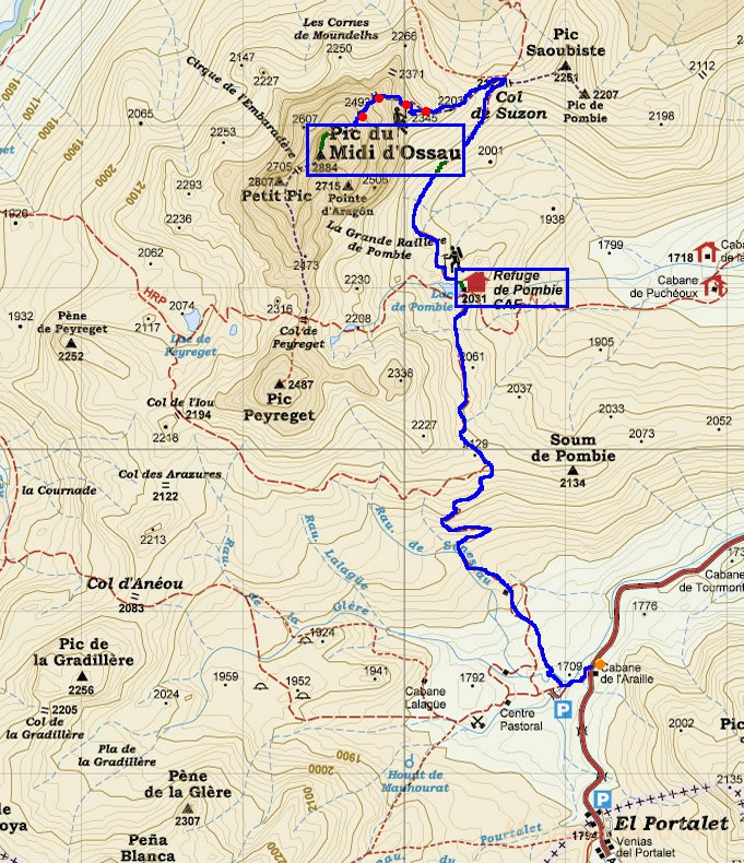 Croquis de la subida al Pic du Midi d’Ossau. Puntos Rojos: Pasos con escalada (IIº +, IIIº-), de rapel o con clavos. Punto Naranja: Parking de la Cabaña de l’Araille.