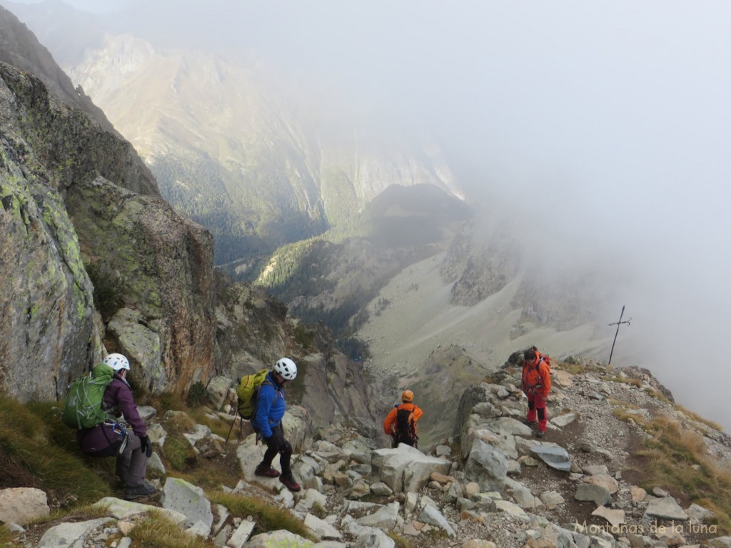 Arriba de este paso o larguilla pared por donde hemos trepamos, el terreno no deja de estar invadido por cientos de enormes rocas (muchas sueltas) y piedrecillas resbaladizas, pero esta vez en un lugar menos vertical y nada peligroso. La niebla comienza a invadirnos, las nubes inundan la cima de la montaña; ya la veíamos desde abajo y ahora ya llegábamos al punto donde nos internábamos en ella. Habíamos perdido de vista a Francesc, Flora, Pep y Carles, pero más arriba vemos como nos gritan buscándonos por la pared. Los vemos junto a una cruz metálica asomada al abismo. Ya tenemos contacto visual. Más arriba ellos irán por delante y nosotros les seguiremos a una distancia por la parte menos empinada y más horizontal de las proximidades de la cima del Midi. Solo hay que seguir los numerosos hitos y la intuición orientativa en la montaña.