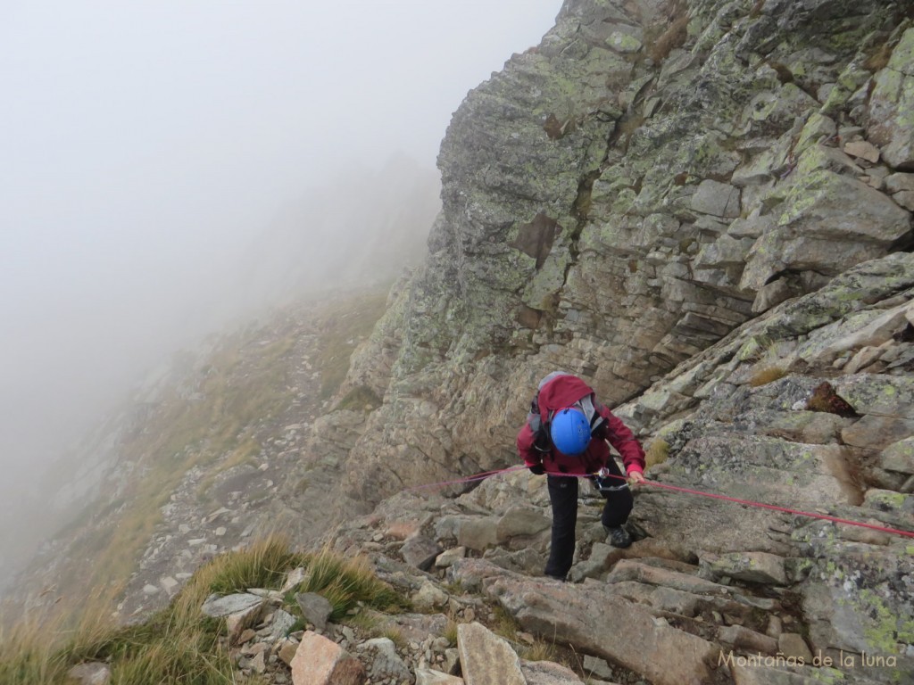 De nuevo los hitos y la intuición orientativa (ir por la parte menos inclinada y más fácil del terreno) nos lleva hasta otra especie de grieta, otro paso esta vez con algunos más clavos que ayudan a progresar por él. Pero al final un paso fácil de IIº: bajo las paredes rocosas pasamos por un pasillito, abajo la montaña funde sus vertientes en el abismo y en un fondo vertical e invisible. Después giramos y nos internamos por el centro del rocoso barranquito superándolo y subiendo siguiendo los hitos y ladera arriba, empinada, bastante empinada. Las piedrecitas sueltas, algo de terreno con terracitas y la roca lisa rodeados de paredes y el abismo tras nuestro, es la predominante en esta subida. Ahora el recorrido gira hacía la derecha y parece que seguimos, sin subir demasiado, la ladera horizontalmente hacía otra parte de la montaña. Dejamos a otro grupito que creía había visto subir en la distancia, que bajan por este tercer paso de IIº entre los pasillitos de roca y el fondo del rocoso barranquito.