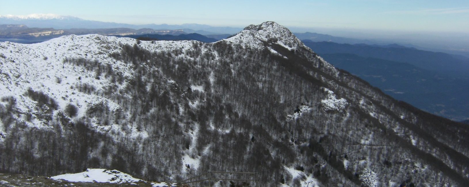 Admiramos el paisaje: el nevado Pirineo con el Canigó el más llamativo y cercano, una mole peculiar y magnífica. Ha perdido nieve, se ven los rastros afeados por el viento que la derrite o hace desaparecer. Cerca de nosotros el otro famoso y fácil pico del Montseny: el Matagalls, también nevado y rodeado de esa magnífica masa boscosa de sus hermosos hayedos, ahora desprovistos de hojas, con troncos estériles y esmirriados; sin esas hojas de colores según la estación del año, no tienen la misma presencia estas bellas frondosas. Y también muy cerca Les Agudes, blanca y próxima dan ganas de visitarla y recorrer sus suaves y altivas laderas cimeras hasta su cumbre solemne y reconocible. Al fondo al sureste la crestada Montserrat, y delante de ella la reconocible La Mola. Hay una visibilidad magnífica gracias al viento.
