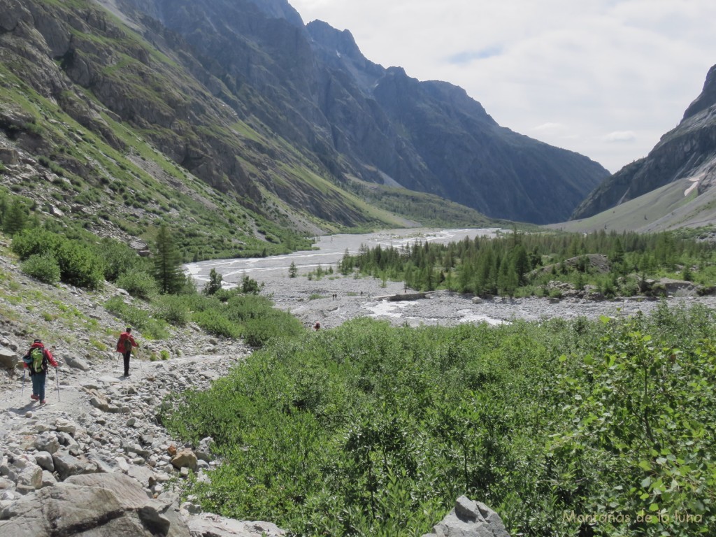 Fotos al glaciar, fotos a la montaña y a la bajada… pasamos cerca del Refugio del Glaciar Blanc pero no nos paramos en él. Seguimos la bajada. Ahora nos encontramos con mucha más gente, curiosos, excursionistas, domingueros que aprovechan el 14 de julio (Fiesta Nacional francesa) para subir a este refugio. Hace sol con pocas nubes pero el frío es intenso a partir de los 2.000 metros. El viento se fortalece cuando entramos en la cuenca del río que baja del glaciar, parece que se encajona y hace como de embudo que lo hace más violento. La gente que sube no van muy abrigados, los vemos con sus mangas cortas y pantalones cortos y nos helamos nosotros mismos solo de verlos ¡Qué frío!