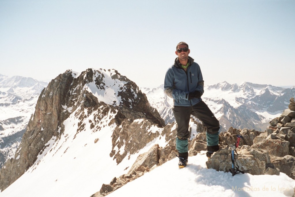 Siguiendo el mapa que llevamos y siendo extraños por aquellos contornos pétreos, nos decidimos subir hasta, lo que parecía un collado entre el Argualas y el Algas para subir al primero. Pero la cresta es más desafiante y abrupta de lo que pensábamos y al no conocerla y por su estado nivoso y helado, después de examinarla por varios puntos, decidimos dejar el Argualas y optar por su hermano menor Algas (3.024 mts.) al que llegamos después de un pequeño paso de trepada y de cruzar pendientes de nieve igualmente verticales. En este pico solo nos encontramos con una pareja que se decide a visitarlo, todos los demás montañeros se dirigen al Garmo Negro y nadie al Argualas. Desde aquí se divisa muy bien el Valle de Tena con la gran muralla de corredores y paredones del Peña Telera y Collarada. El día, como el de ayer, es increíble, la nieve en muy buen estado y un sol que nos quema la piel. Decidimos bajar hasta la ruta normal y subir con el resto de la romería al Garmo Negro; que por rampas y pendientes también muy inclinadas, te dejan en su pequeña y recortada cumbre (3.066 mts.), donde hay más montañeros que suben, bajan, descansan… Éste te ofrece una espectacular visión de los Picos del Infierno, del Argualas y Algas, ya que se encuentra casi en el centro de la zona.