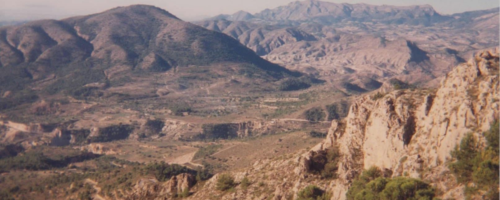 Panorámica suroeste de la comarca de La Marina Baja. De izquierda a derecha: costas altas de Villajoyosa y el Campello, al fondo los cabos de La Huerta y Santa Pola, Sierra d’Orxeta, abajo Baranc d’Angero, detrás estribaciones del Carcondo y Traviesa, al fondo Cabeçó d’Or y La Grana, delante derecha Alt del Realet