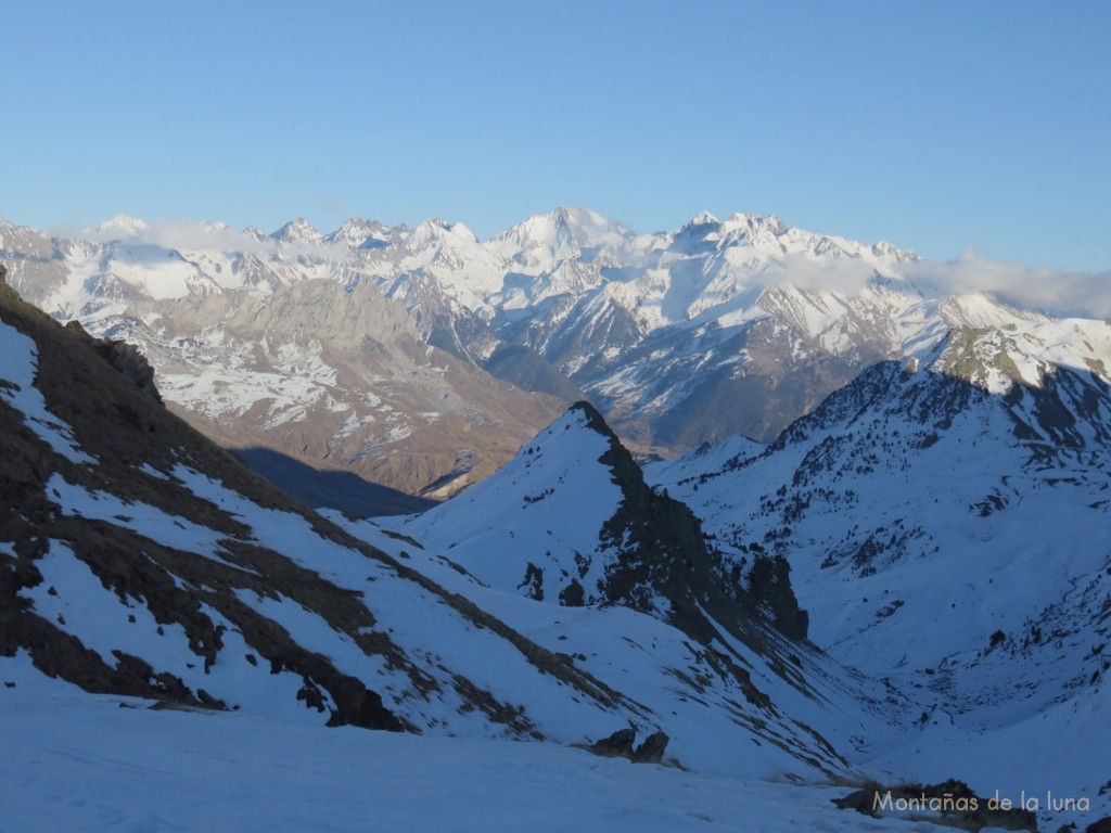 A la izquierda Los Infiernos, al fondo el Vignemale, a la derecha el Garmo Negro (el puntiagudo), Algas y más a la derecha Argualas