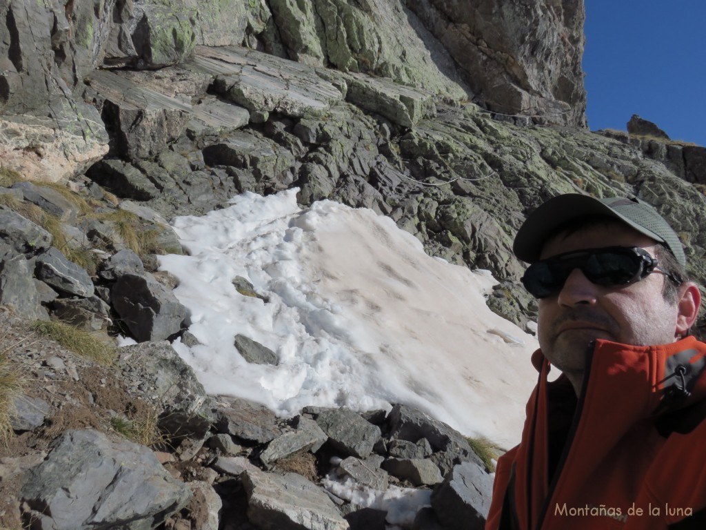 Subo a otra especie de collado o llano, sigo en dirección al perfecto cilindro de roca y paredes, forma que tiene este pico desde este lado. Me recuerda a otra montaña pero no recuerdo a cual… aunque mientras escribo estas letras me viene a la mente la imagen del Naranjo de Bulnes… Estoy incómodo. Tengo el estómago como revuelto, la tripa inquieta… creo que sé lo que me pasa, o lo hago o no puedo seguir; me acerco a un rincón junto a las rocas rojizas, ferruginosas volcánicas y hago de vientre ¡¡¡Uuufffff!!! Ya puedo seguir. Ahora cambio de vertiente y de nuevo me enfilo por el este por otra empinada pala de nieve hasta las mismas rocas del cilindro, hasta las mismas cadenas. Acaba la nieve y comienza la travesía por la roca con las cadenas. A la derecha la ladera acaba en una pared o abismo que no logro a ver desde aquí, y debajo de ésta el gran llano nevado y precioso de los Ibones de Anayet.
