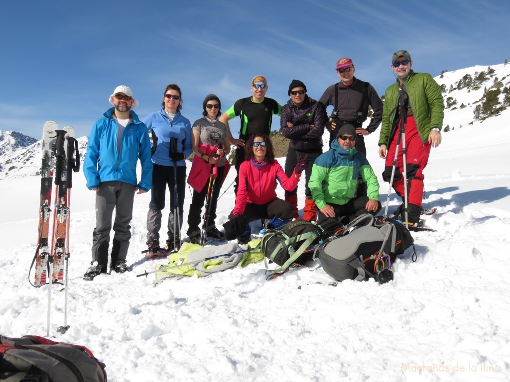 Fotos al espectacular paisaje. Lástima no tener tiempo para subir al Pic de l’Estanyó, ya que las vistas hubieran sido impresionantes, espectaculares. Comenzamos la bajada casi desandando el camino, pero esta vez sí que seguiremos unas huellas que van por encima del Río de l’Estanyó (oculto bajo el abundante manto de nieve), siguiendo una dirección recta y directa hacia el fondo del Valle del Sorteny, y de las proximidades del su refugio.